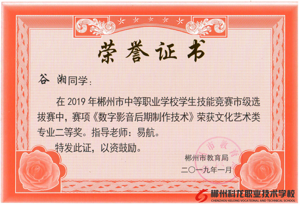 祝賀李嘉琪、趙美娟、李佳悅、李柏均、D1801班(班集體)、鄺獻(xiàn)韜、曹政、谷湘同學(xué)在2018—2019學(xué)年度表現(xiàn)突出,分別被評為市級三好學(xué)生、市級優(yōu)秀班干部、市級優(yōu)秀實習(xí)生、市級優(yōu)秀班集體及在2019年郴州市中等職業(yè)學(xué)校技能競賽市級選拔賽中,賽項《數(shù)字影音后期制作技術(shù)》、《動畫片制作》分別榮獲文化藝術(shù)類專業(yè)、信息技術(shù)類專業(yè)二等獎、三等獎。