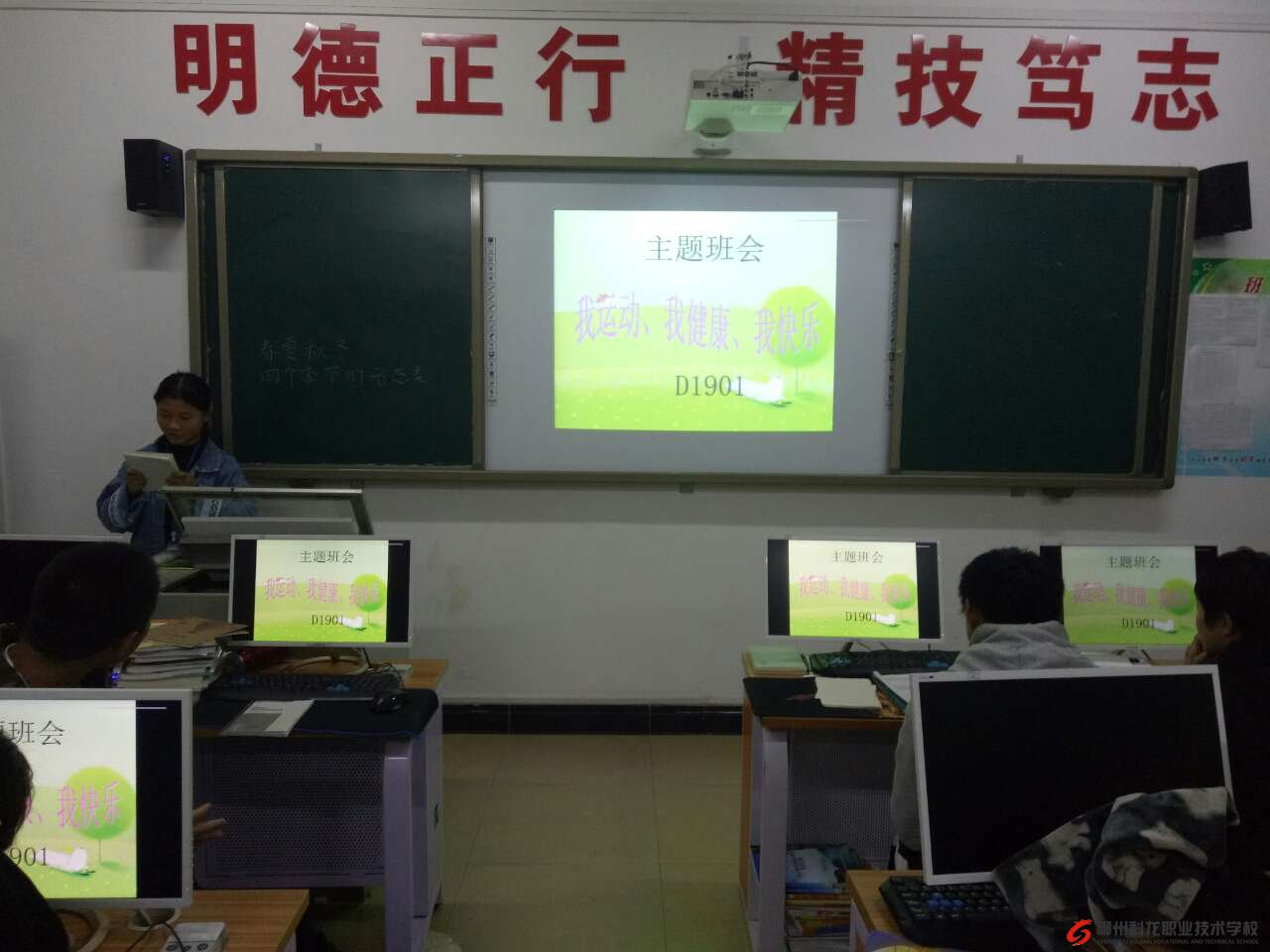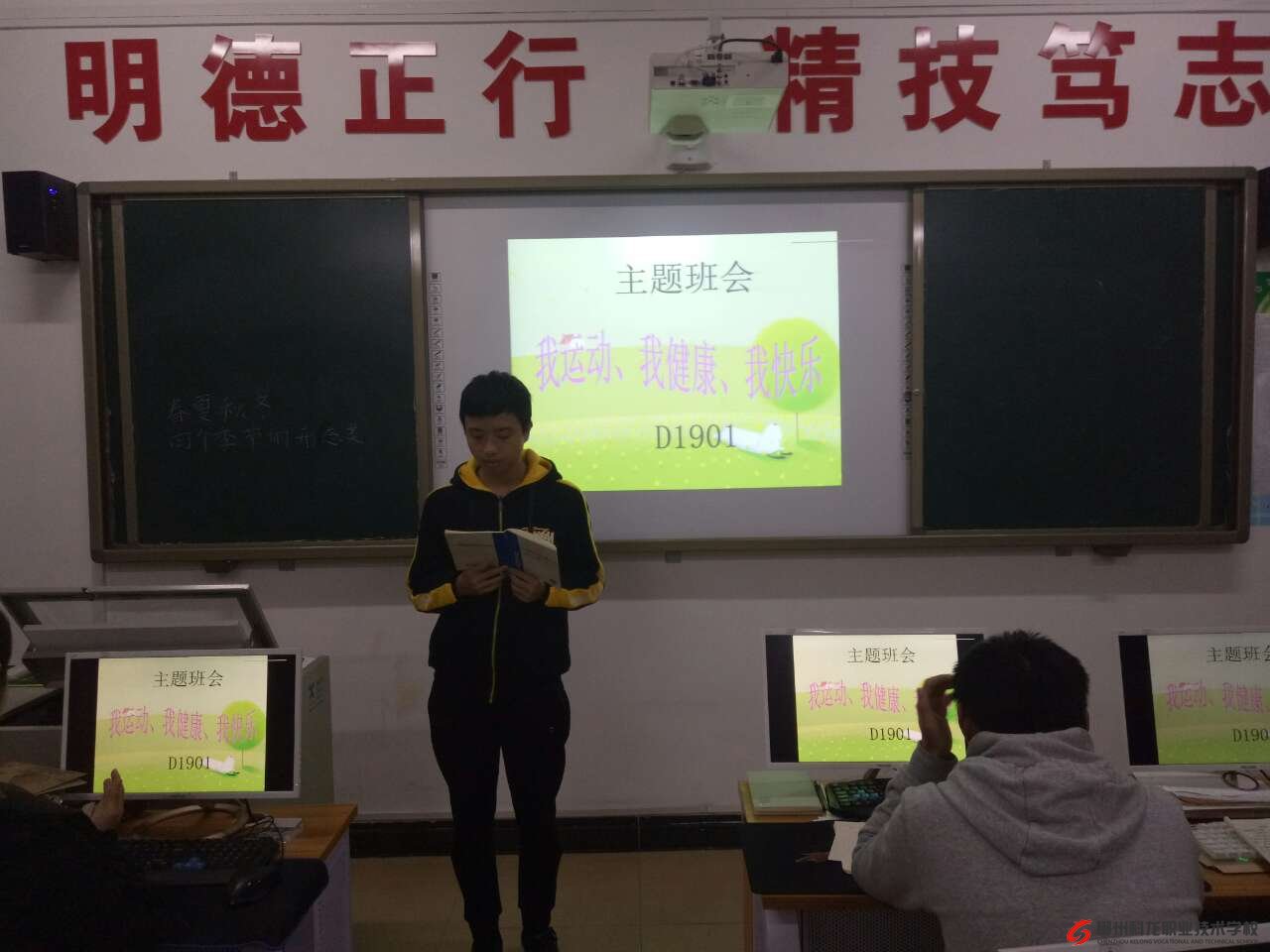 2019年10月28日D1901班為了配合學(xué)校運動會的舉行,開展《我運動、我健康、我快樂》的主題班會,每位同學(xué)輪流發(fā)言,旨在發(fā)動同學(xué)們積極參與體育鍛煉,全面提高個人自身素質(zhì)。